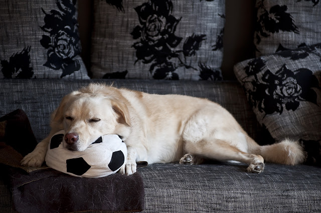 Qualche giorno fa, di passaggio all'IKEA, gli abbiamo comprato un pallone morbidone di peluche, sicuri che sarebbe stato di suo gusto. Ma non immaginavamo quanto... Appena arrivati a casa glielo abbiamo dato ed è letteralmente impazzito di gioia. Se lo è preso tra le zampe e ha cominciato a morderlo e rilasciarlo... Morso e rilascio, morso e rilascio, velocemente. E voracemente! Se lo cacciava praticamente in gola... Ma la cosa che ci ha divertito di più, e il motivo di questo post, è successa alla fine. Giusi e io ci siamo seduti a tavola a prenderci un caffé, e lui se ne è andato via. Dopo un po' lo abbiamo trovato in sala che ronfava e ci siamo fatti una grassa risata. Perché? Beh, per scoprirlo bisogna scorrere tutte le foto fino all'ultima.